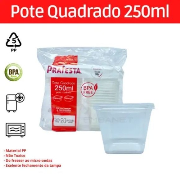 O POTE QUADRADO COM TAMPA – 250 ML – KIT COM 20 UNIDADES – PRAFESTA É PERFEITO PARA ARMAZENAMENTO E TRANSPORTE DE ALIMENTOS COM SEGURANÇA E PRATICIDADE. SUA ESTRUTURA QUADRADA OTIMIZA O ESPAÇO EM FREEZERS, GELADEIRAS E ESTANTES, ENQUANTO SUA TAMPA DE ENCAIXE FIRME GARANTE VEDAÇÃO EFICIENTE, EVITANDO VAZAMENTOS. FABRICADO EM MATERIAL RESISTENTE, É COMPATÍVEL COM FREEZER E MICRO-ONDAS, SENDO INDICADO PARA PORÇÕES INDIVIDUAIS, MOLHOS, SALGADOS, SOBREMESAS E OUTRAS PREPARAÇÕES.